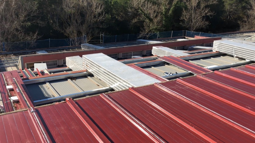 Doblat de coberta formada per noves canals de xapa i panells de color vermell teula. Totalment rematada amb peces del mateix tipus de xapa i color.